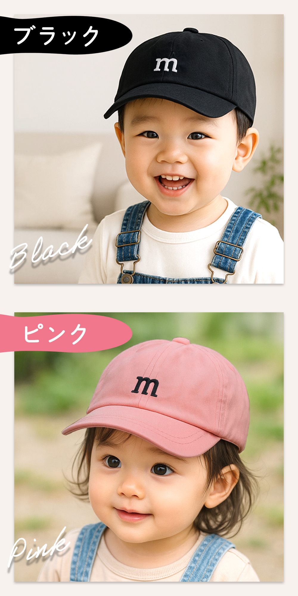 流行のくすみカラーを取り入れた、シンプルでかわいいベビー・キッズ向けキャップ 帽子。アルファベットのワンポイントが上品に映えて、男の子・女の子どちらのカジュアルコーデにも合わせやすいデザインです。おそろいコーデやリンクコーデにも使いやすく、写真映えもばっちり。