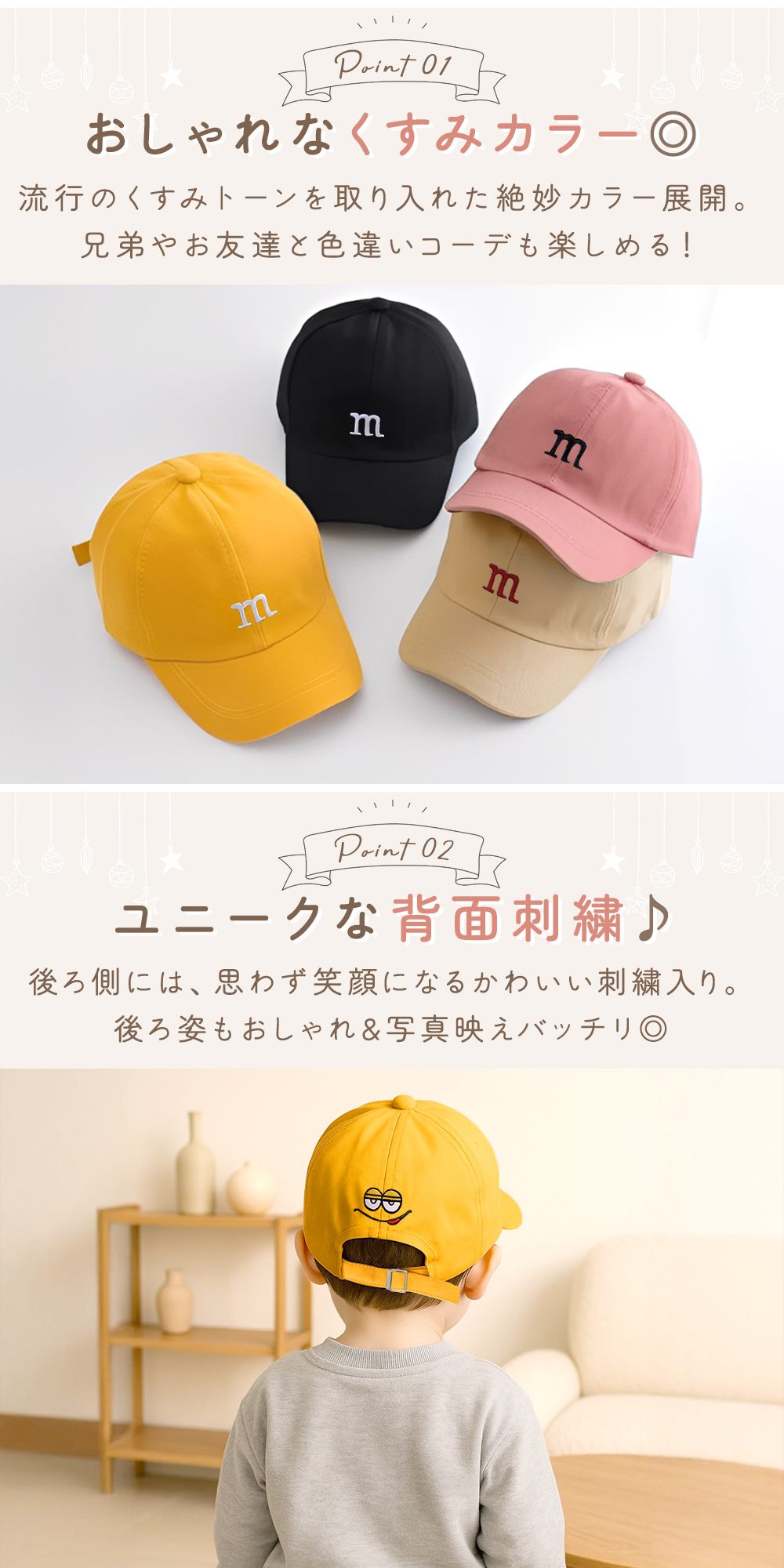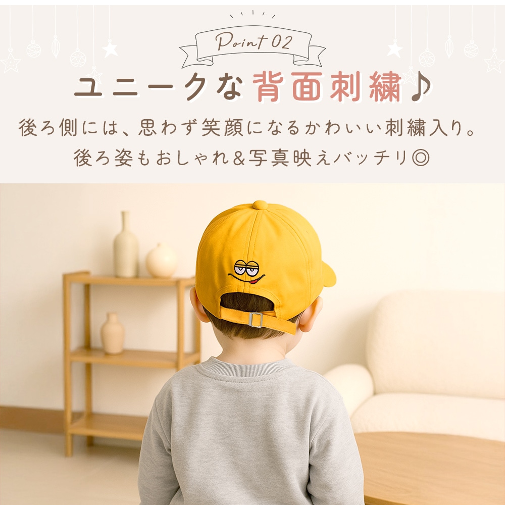 正面のワンポイントだけでなく、後ろ姿もかわいく見える工夫で、どの角度から見てもおしゃれ。普段使いはもちろん、家族でのお出かけやイベント、旅行でも頼れるぼうしです。ベビーからジュニアまで、毎日の定番アイテムとして一つあると便利。