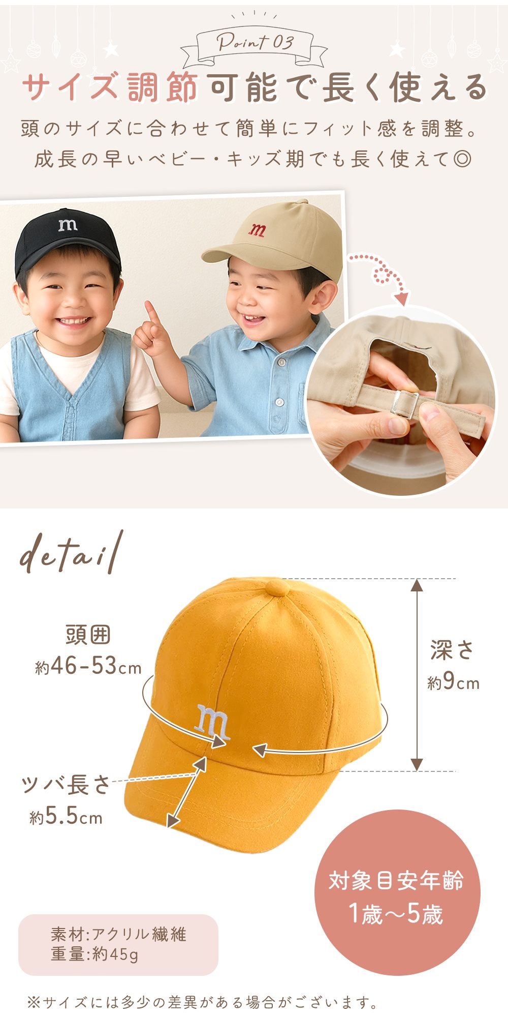 後ろのベルトでサイズ調節ができるから、頭のサイズに合わせてフィット感を簡単に調整。1歳・2歳・3歳・4歳・5歳頃まで、成長の早い時期でも「今ちょうどいい」を保ちやすく、買い替え回数を減らせるのがうれしいポイントです。