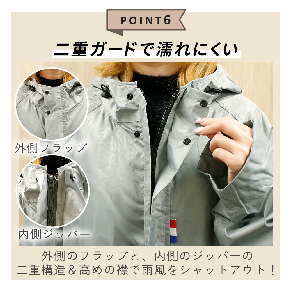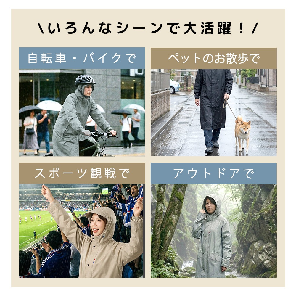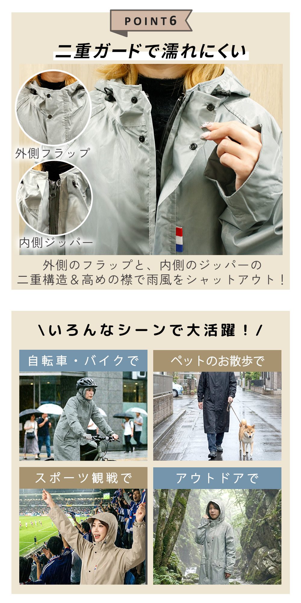 ロング丈設計により、雨や雪、泥跳ねから足元までしっかりガードします。裾は動きを妨げにくい仕様で、自転車やバイクでの移動時にも使いやすい設計です。通勤・通学はもちろん、スポーツ観戦、野外活動にも適しています。
