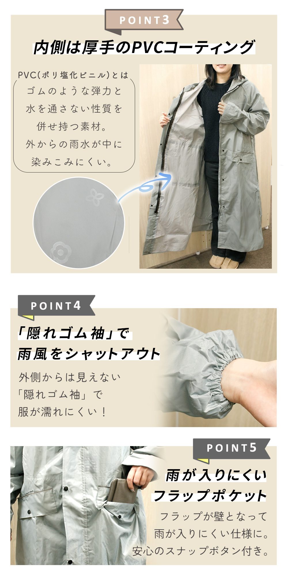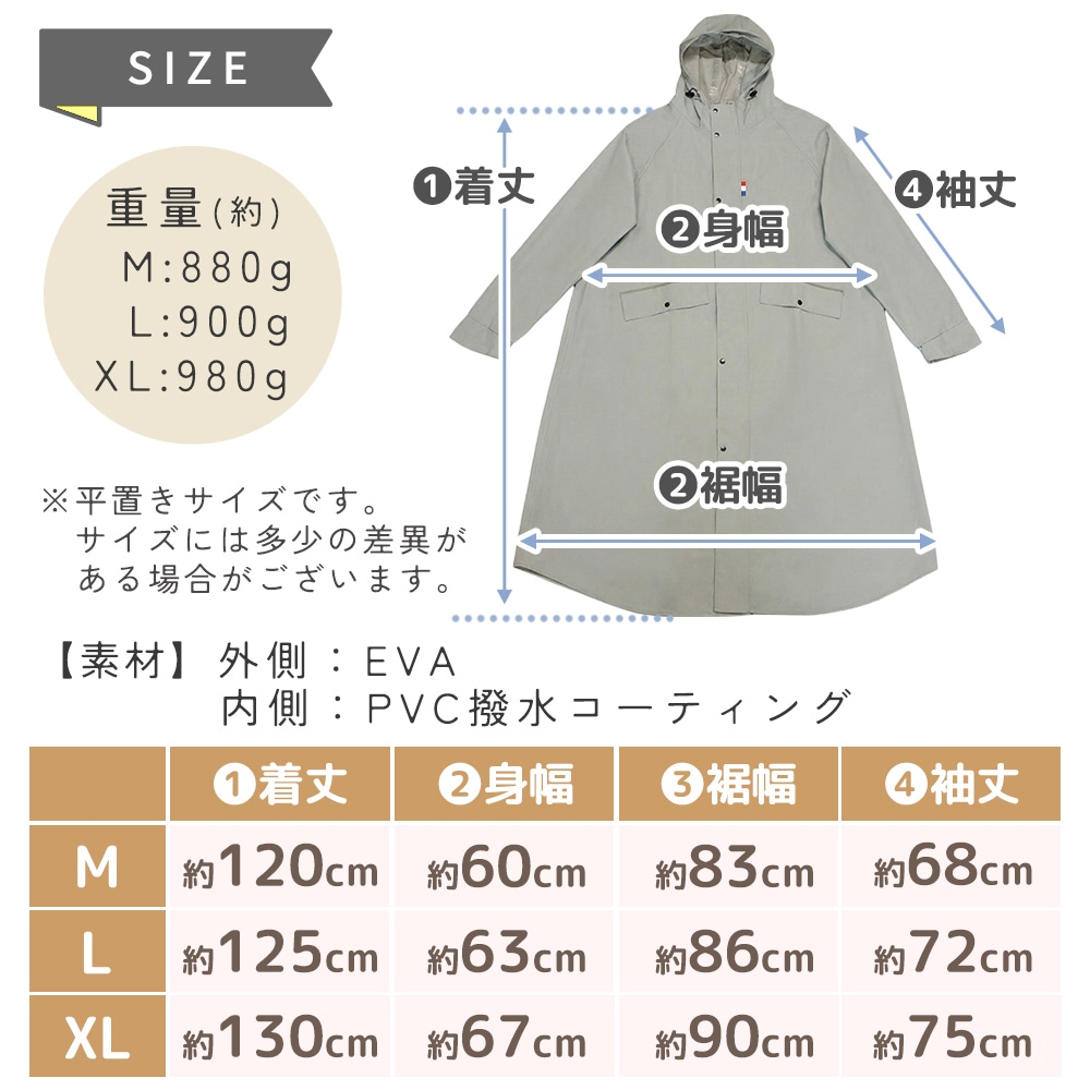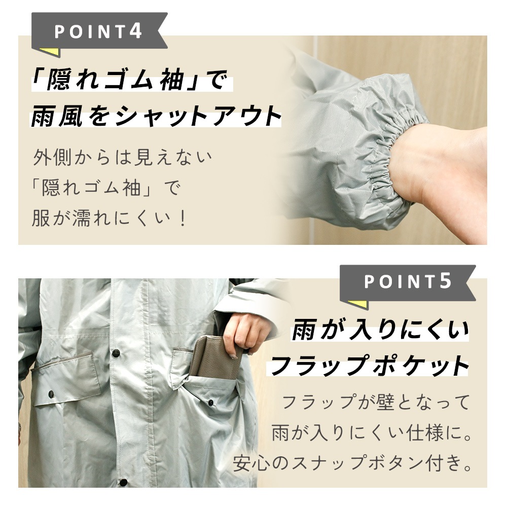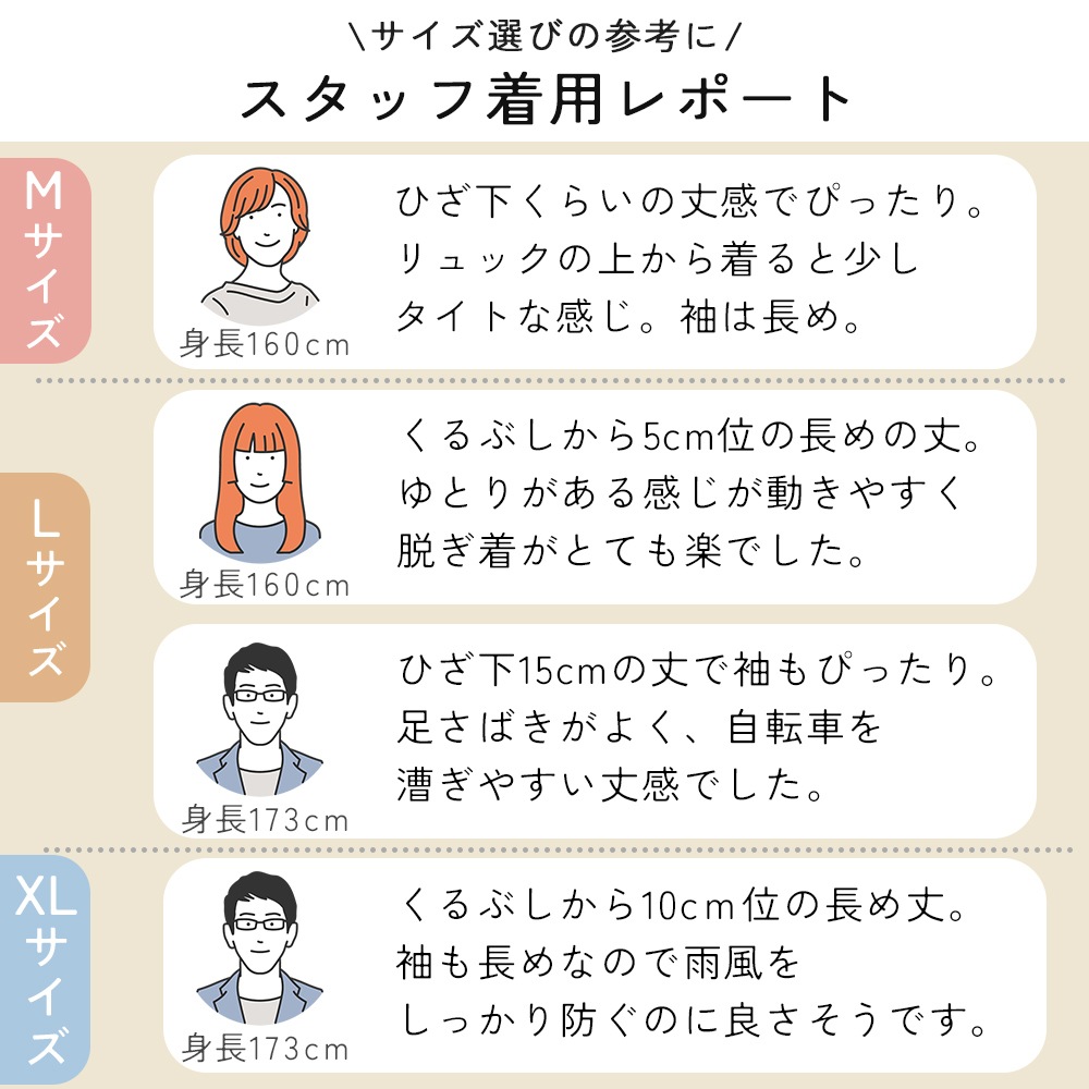 ロング丈設計により、雨や雪、泥跳ねから足元までしっかりガードします。裾は動きを妨げにくい仕様で、自転車やバイクでの移動時にも使いやすい設計です。通勤・通学はもちろん、スポーツ観戦、野外活動にも適しています。
