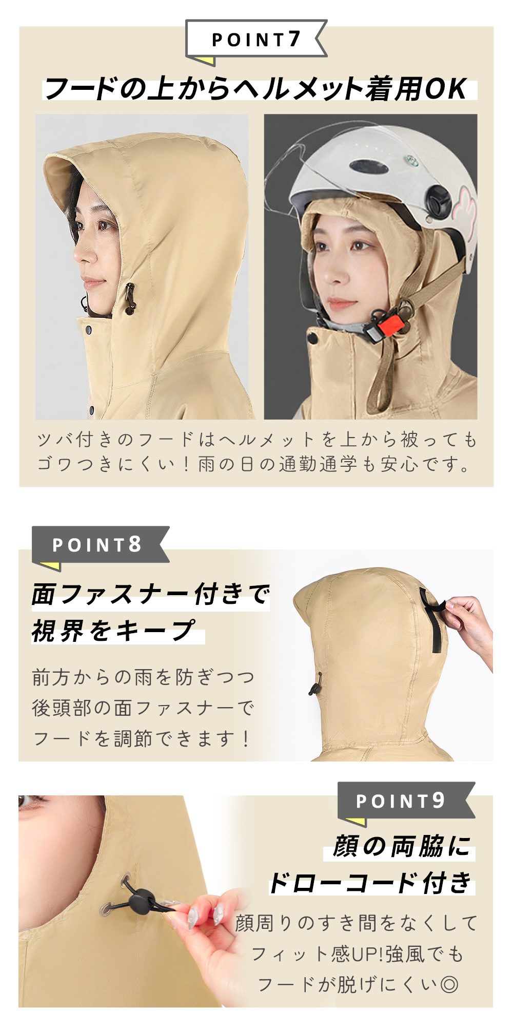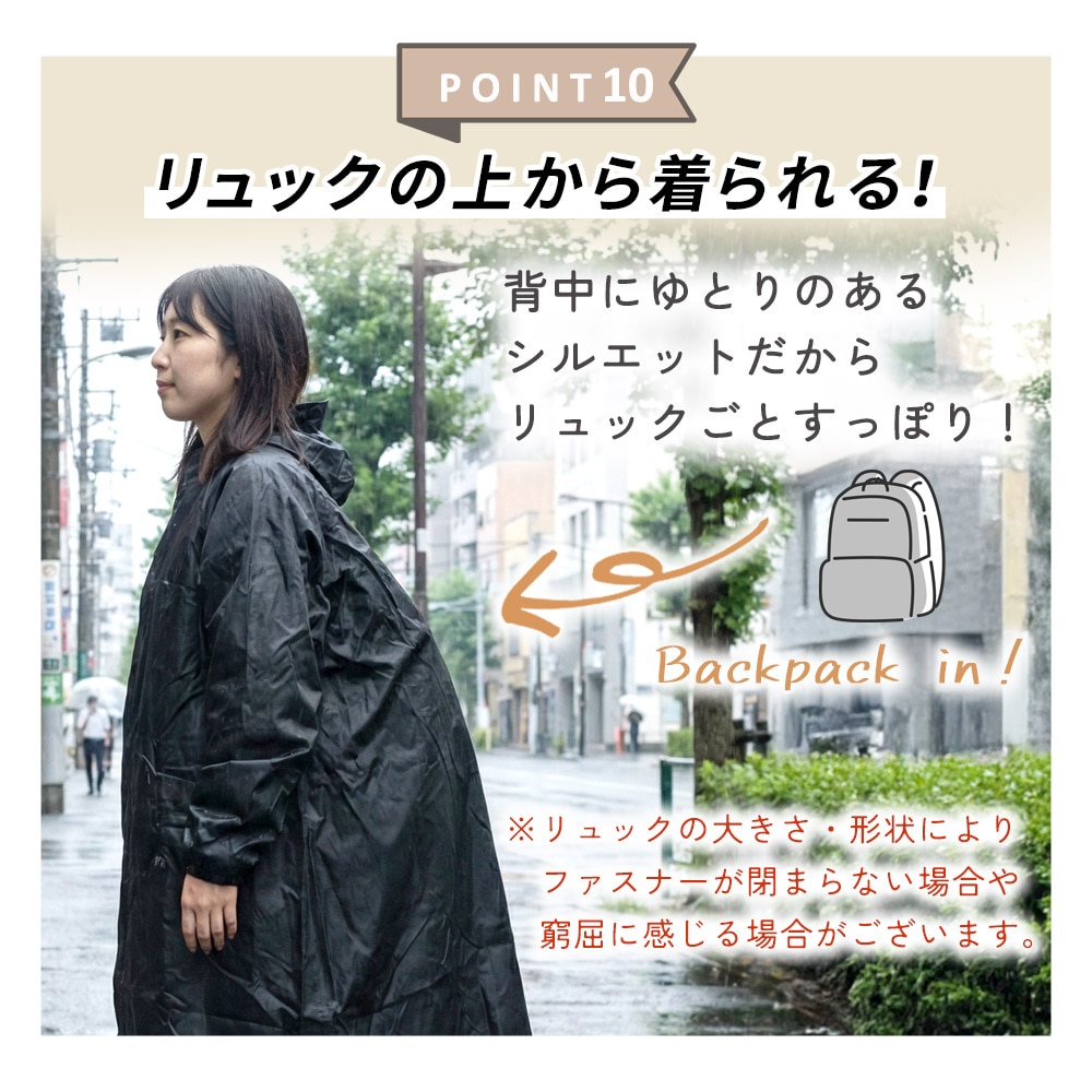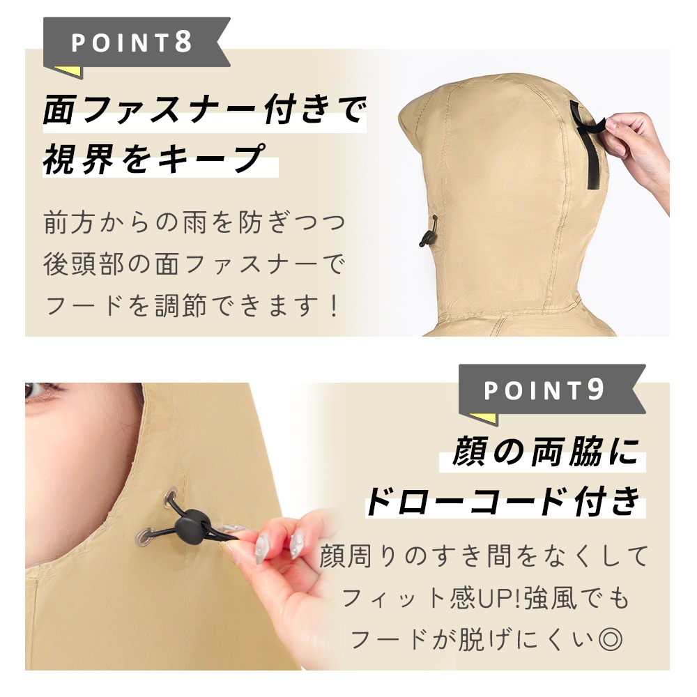 ツバ付きフードは視界を確保しやすく、前方からの雨を軽減します。ヘルメット対応のため、自転車やバイク利用時にも着用可能。背中にゆとりのある設計で、リュックの上から着用しやすく通勤、アウトドア、防災まで幅広く対応します。