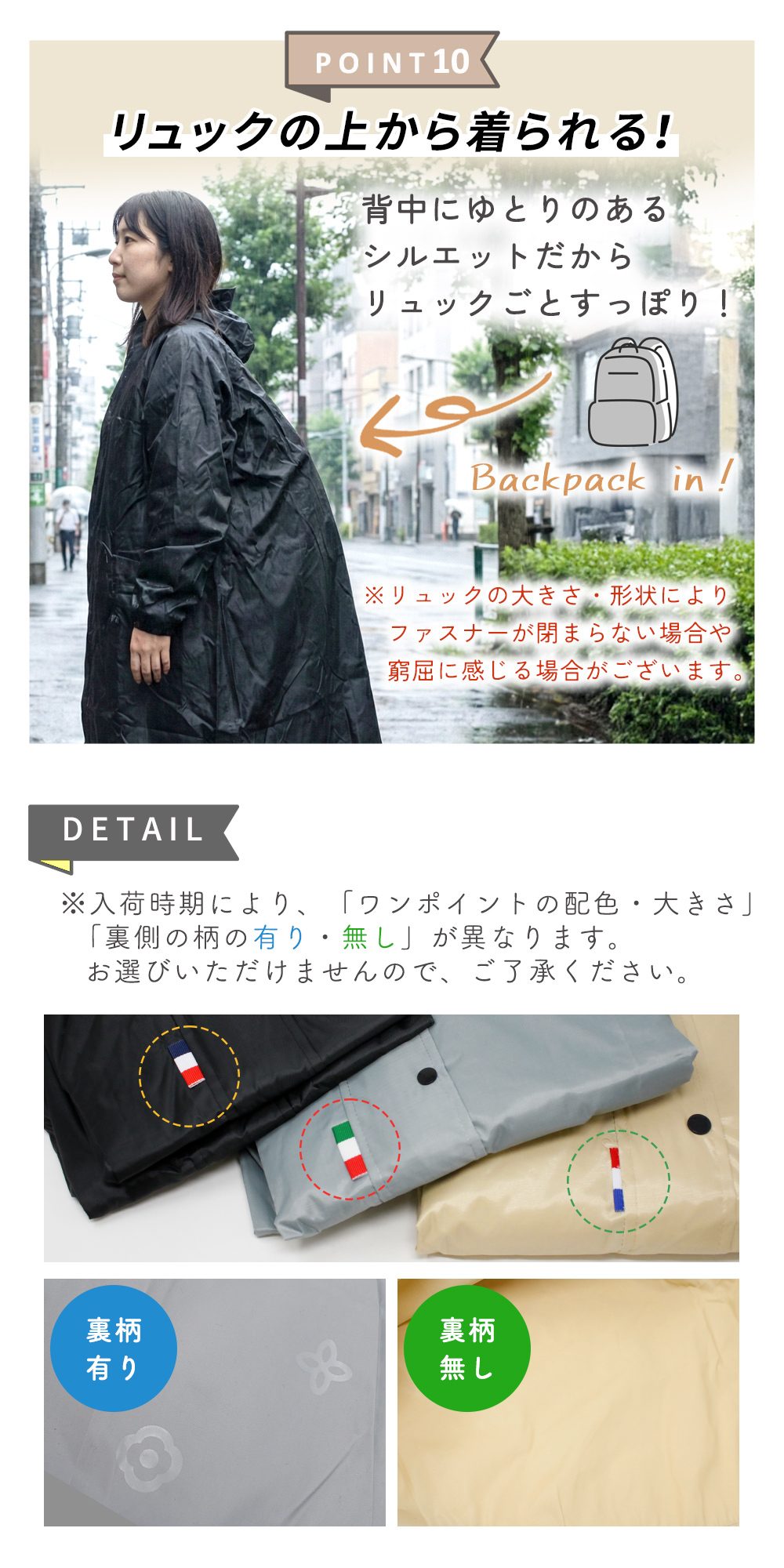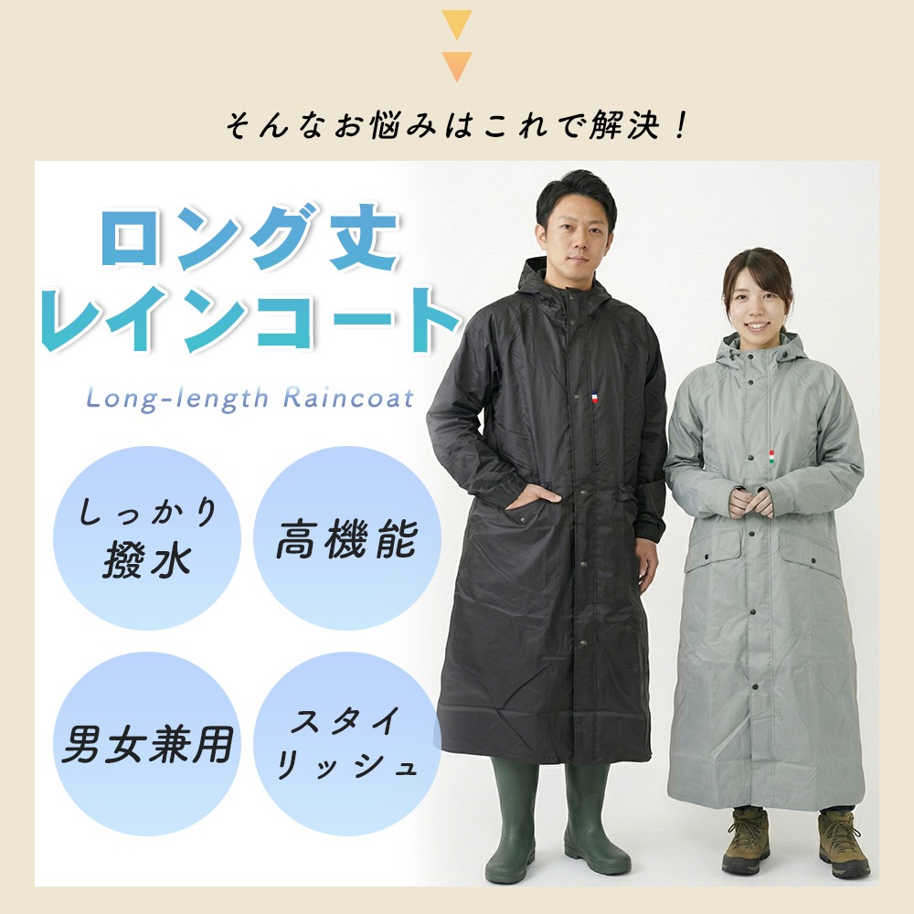 男女兼用で着用できるユニセックス仕様のレインコートです。装飾を抑えた落ち着いたデザインのため、通勤やお出かけなど日常の雨対策に使いやすく、シーンを選ばず着用できます。
