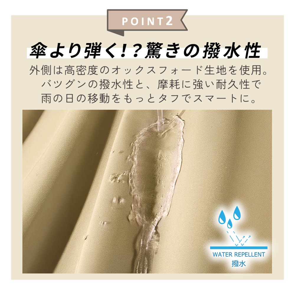 外側には耐久性に優れたオックスフォード生地を使用。内側にはPVCコーティングを施し、雨水が染み込みにくい構造です。梅雨時期の使用だけでなく、台風や悪天候時、防災用としての備えにも役立ちます。